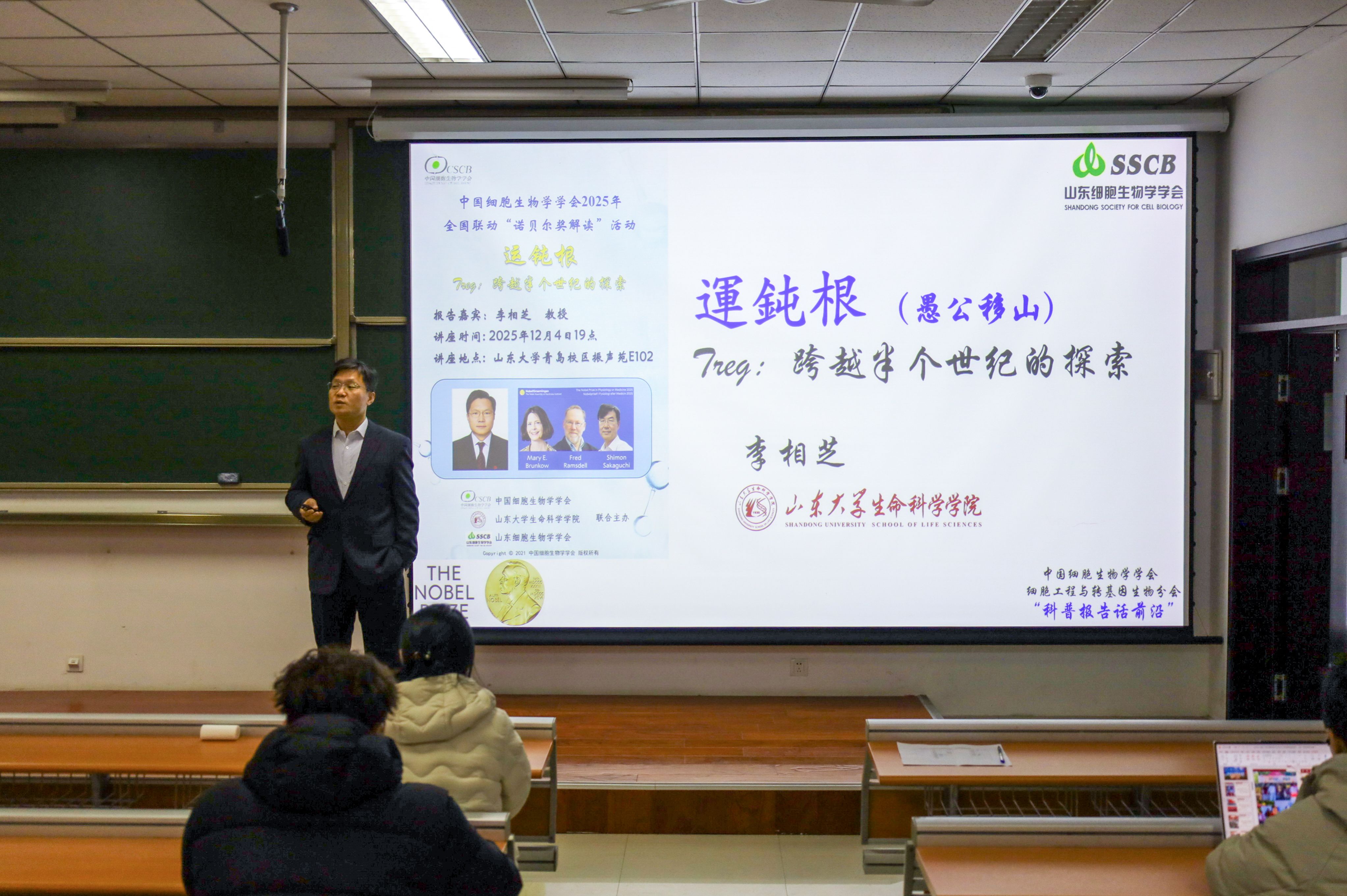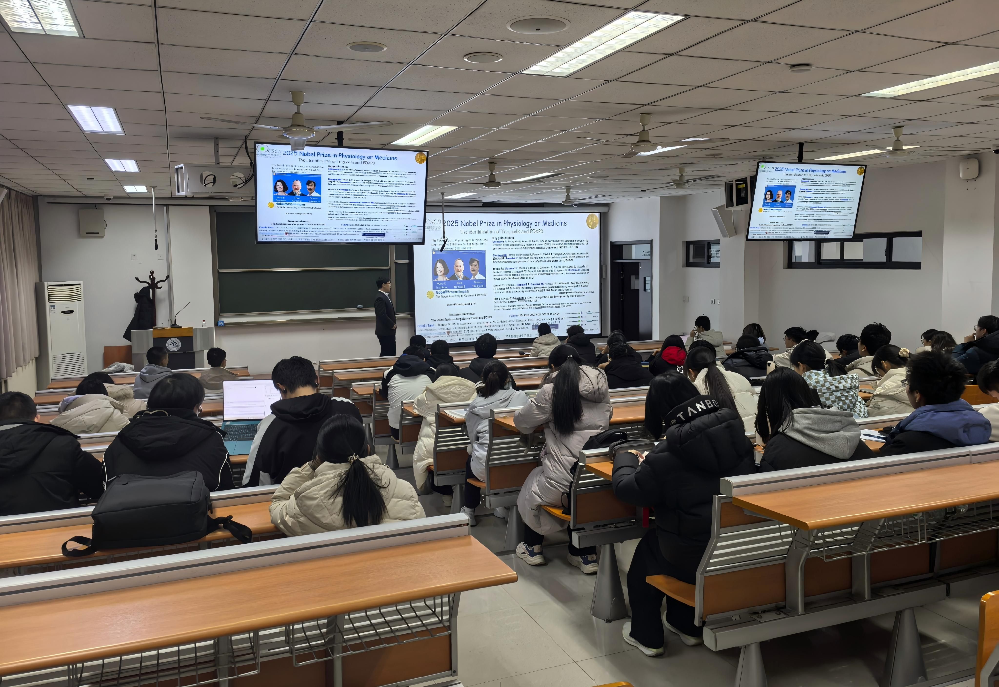 李相芝围绕2025年诺贝尔生理学或医学奖获奖成果,系统解读了免疫学家坂口志文在T细胞调控研究中的关键贡献。他从多田富雄1971年提出的免疫抑制性T细胞概念讲起,梳理了Treg细胞的发现、“Treg–Foxp3–免疫耐受”调控轴的建立及其在自身免疫病、过敏与肿瘤治疗中的转化意义,清晰呈现该领域跨越半个世纪的演进脉络。李相芝还结合山东大学与卡罗林斯卡医学院的合作背景,分享了诺奖评审的严谨流程与现场见闻,为学生揭开诺奖神秘的面纱。