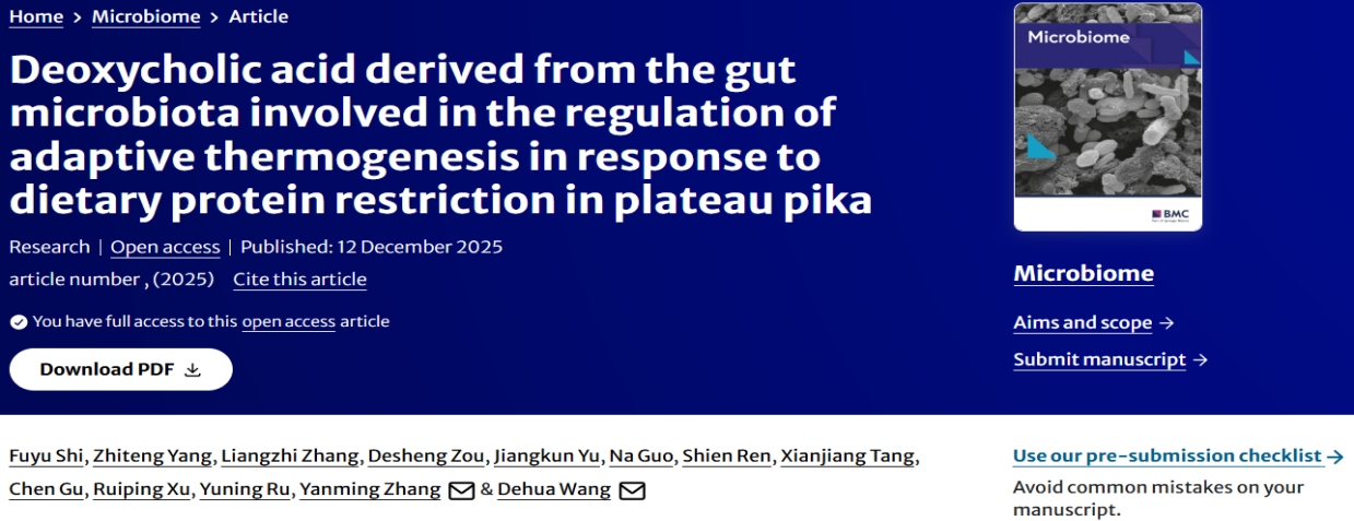 12月12日,山东大学生命科学学院王德华教授团队在Microbiome上发表题为“Deoxycholic acid derived from the gut microbiota involved in the regulation of adaptive thermogenesis in response to dietary protein restriction in plateau pika”的研究成果。该研究发现在冬季蛋白胁迫下,肠道微生物通过调控肝脏FGF21信号通路调节机体的适应性产热,为深入理解哺乳动物在高海拔严酷环境下的生理适应策略提供了新的视角。