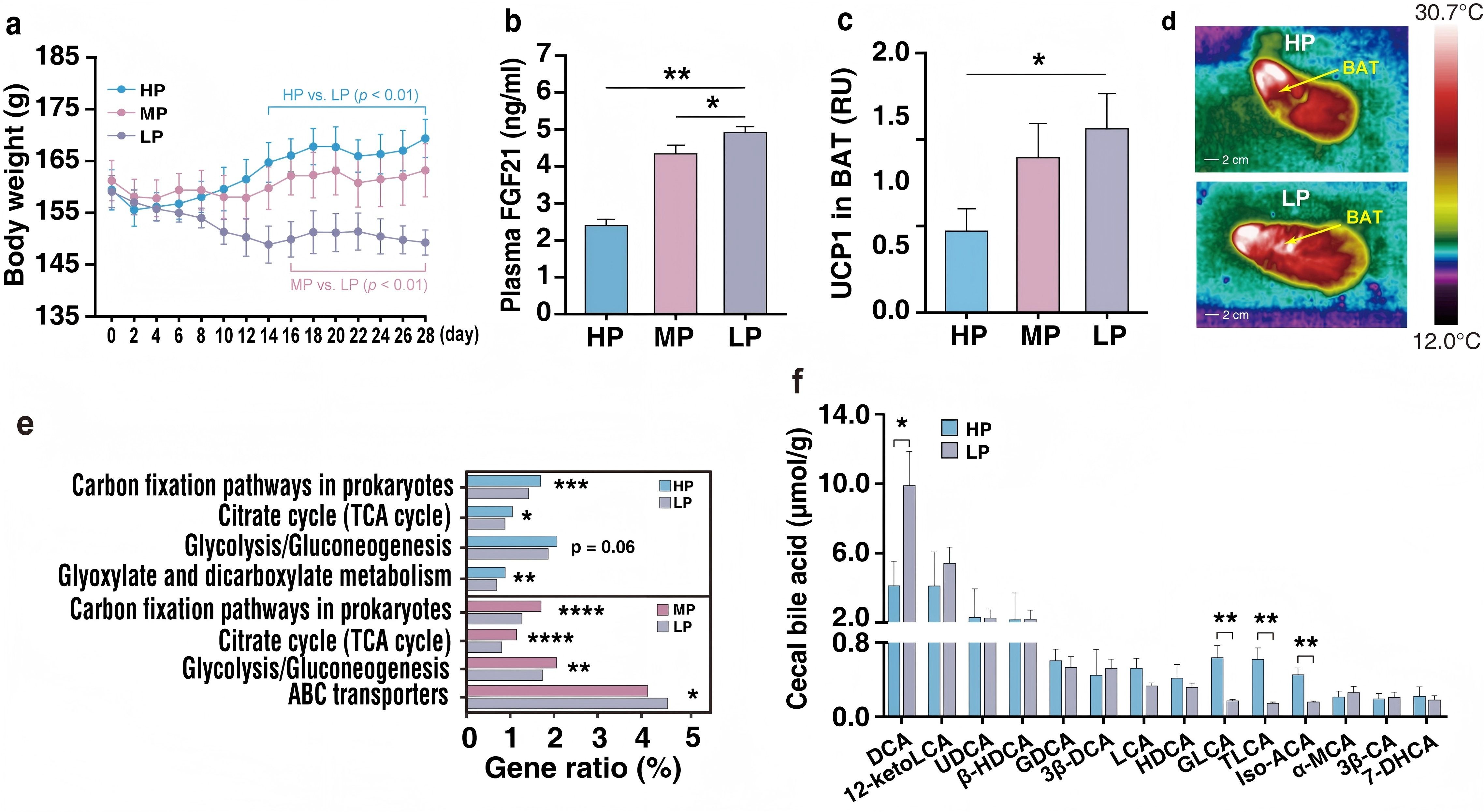给饲喂低蛋白食物的高原鼠兔补充外源性的牦牛粪菌后,鼠兔的体重和体脂含量显著增加。机制分析发现,牦牛粪菌的介入降低了鼠兔体内产生DCA的细菌丰度及DCA浓度,从而抑制了肝脏GCN2-eIF2α-FGF21通路的活性,抑制BAT产热水平,使得体重增加。