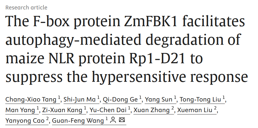 1月2日,山东大学生命科学学院王官锋教授团队在Molecular Plant发表了题为The F-box protein ZmFBK1 facilitates autophagy-mediated degradation of maize NLR protein Rp1-D21 to suppress the hypersensitive response的研究论文。该研究揭示了玉米F-box蛋白ZmFBK1调控NLR蛋白Rp1-D21的稳定性和亚细胞定位,主要通过与ZmATG6互作促进自噬精细调控植物免疫反应,为阐明FBK类蛋白在NLR介导的防卫反应中的作用机制提供了新范式。