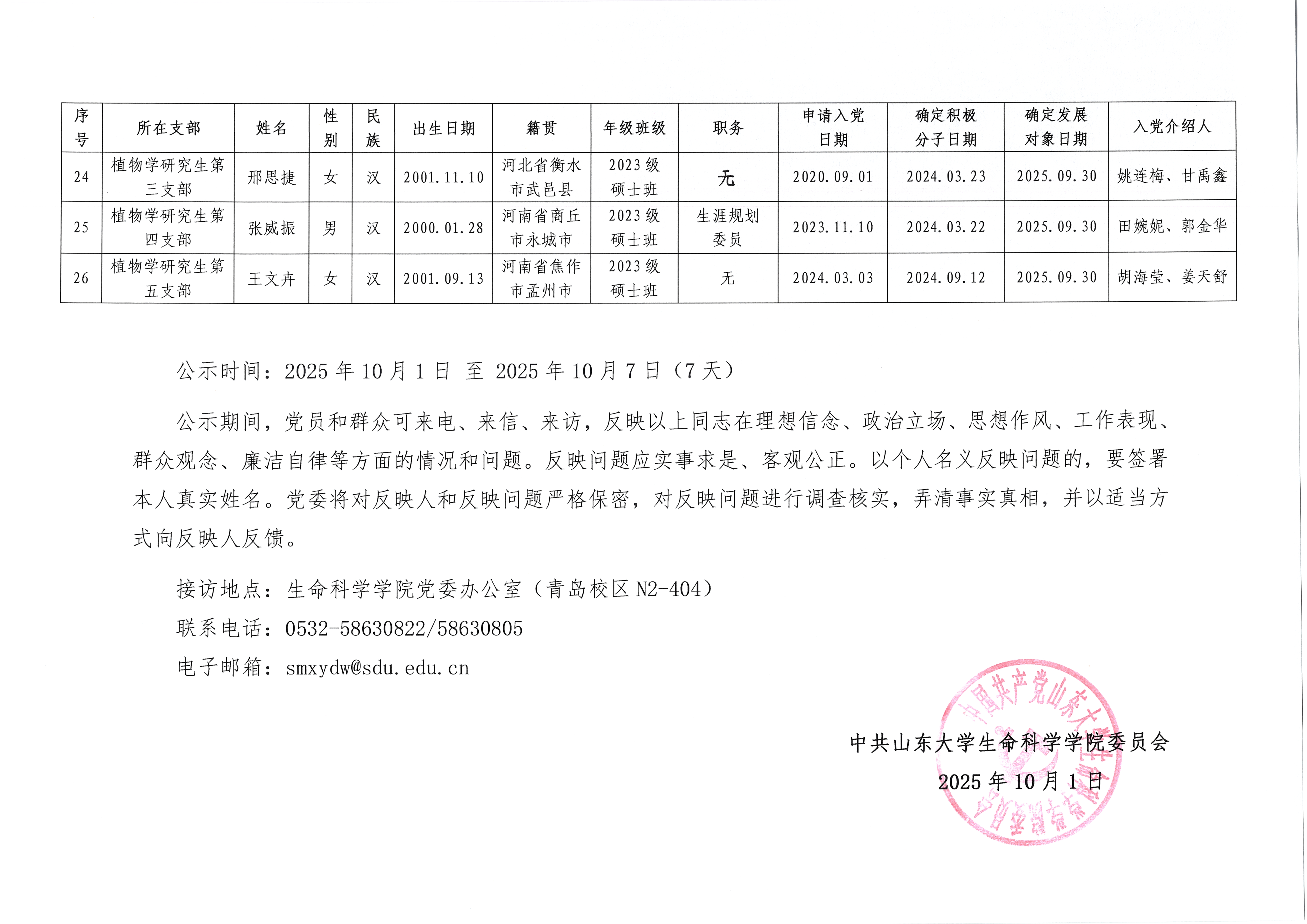 关于确定王思覃等26名学生为发展对象的公示公告