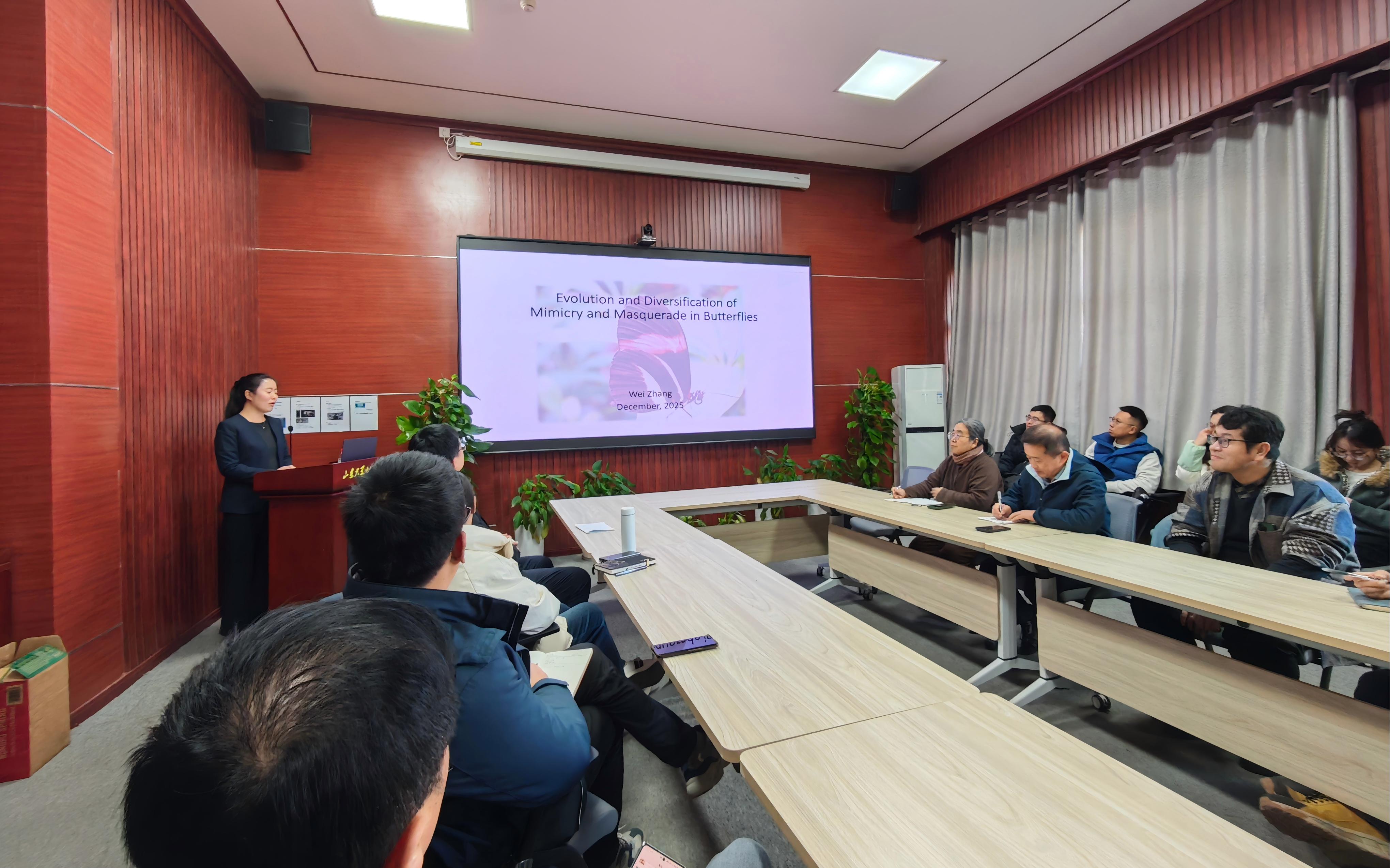 张蔚教授系统介绍了枯叶蛱蝶的翅花纹离散形态、分子形成机制和起源与演化规律,并以蛱蝶科袖蝶属为例,讲述了昆虫的物种形成和适应性辐射特征,以及生物在自然选择的定向作用下如何实现生存与繁衍之间的权衡。张蔚教授还分享了利用部分蝴蝶对马兜铃酸的毒素抑制特性,开展针对化学诱变和氧化损伤相关药物研发的工作。报告通过翔实案例与数据,呈现出昆虫演化策略的多样性,并展现了基础研究与产业应用结合的实践路径。与会师生与张蔚教授展开深入交流研讨,激发了师生们的科研热情。